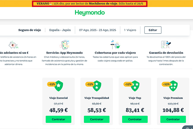HEYMONDO y MOCHILEROSDEVIAJE te ofrecen un 15% de descuento en todos sus seguros gracias a la promoción Heymondo verano hasta el 29 de junio 2025.